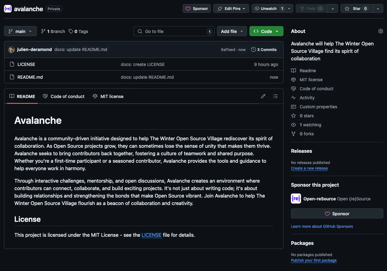 README.md # AvalancheAvalanche is a community-driven initiative designed to help The Winter Open Source Village rediscover its spirit of collaboration. As Open Source projects grow, they can sometimes lose the sense of unity that makes them thrive. Avalanche seeks to bring contributors back together, fostering a culture of teamwork and shared purpose. Whether you're a first-time participant or a seasoned contributor, Avalanche provides the tools and guidance to help everyone work in harmony.Through interactive challenges, mentorship, and open discussions, Avalanche creates an environment where contributors can connect, collaborate, and build exciting projects. It's not just about writing code; it's about building relationships and strengthening the bonds that make Open Source vibrant. Join Avalanche to help The Winter Open Source Village flourish as a beacon of collaboration and creativity.## LicenseThis project is licensed under the MIT License - see the [LICENSE](LICENSE) file for details.