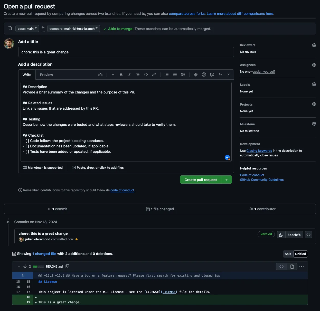 Great work! You’ve now set up a pull request template for your project, making it easier for contributors to submit well-structured changes and for maintainers to review them efficiently. As your project evolves, you can tweak this template to better reflect your workflows and community needs. Remember, thoughtful templates contribute to a positive experience for everyone involved, helping your project grow sustainably.