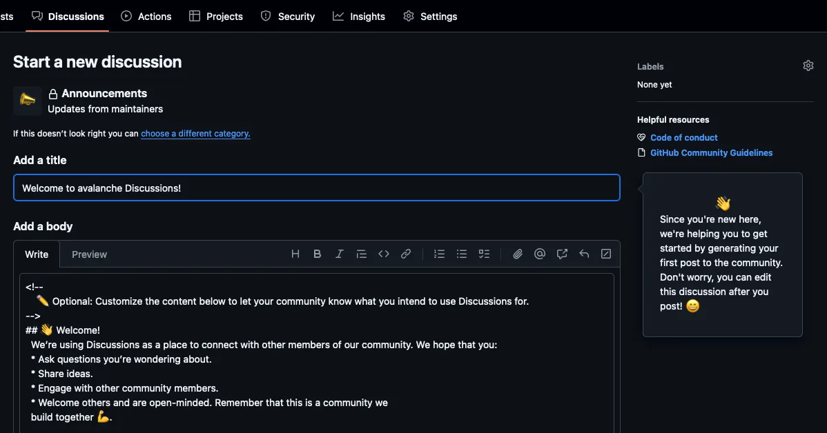 After enabling Discussions, GitHub will redirect you to the new Discussions tab. It will prompt you to create a welcome discussion post in Markdown format. Use this post to introduce Discussions to your community, welcome new users, and outline the purpose of the space.